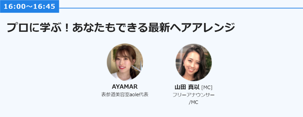 YouTubeチャンネル「AYAMAR美ヘアチャンネル」も大人気のAYAMARが、セルフでできる最新ヘアアレンジを実演しながらご紹介いたします。