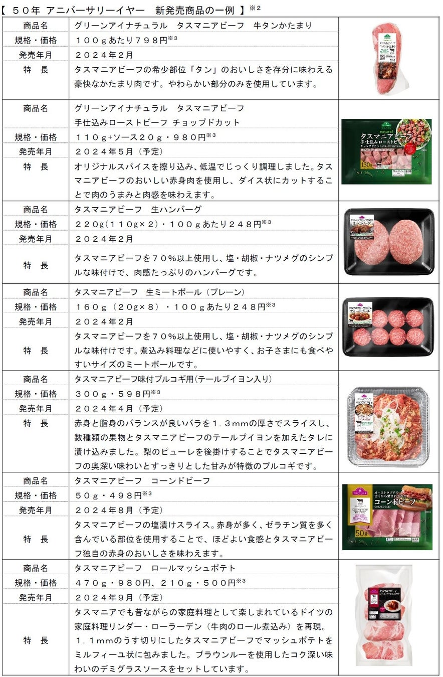 50周年のアニバーサリーイヤーとなる本年は、より多くの方に、より手軽にタスマニアビーフのおいしさを味わっていただけるよう、調理しやすい形状にカットした精肉や下ごしらえ済みの商品、加工品など、約50品目の新商品を順次発売します。