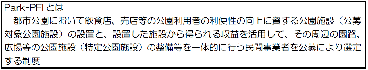 都市公園において飲食店、売店等の公園利用者の利便性の向上に資する公園施設(公募対象公園施設)の設置と、設置した施設から得られる収益を活用して、その周辺の園路、広場等の公園施設(特定公園施設)の整備等を一体的に行う民間事業者を公募により選定する制度