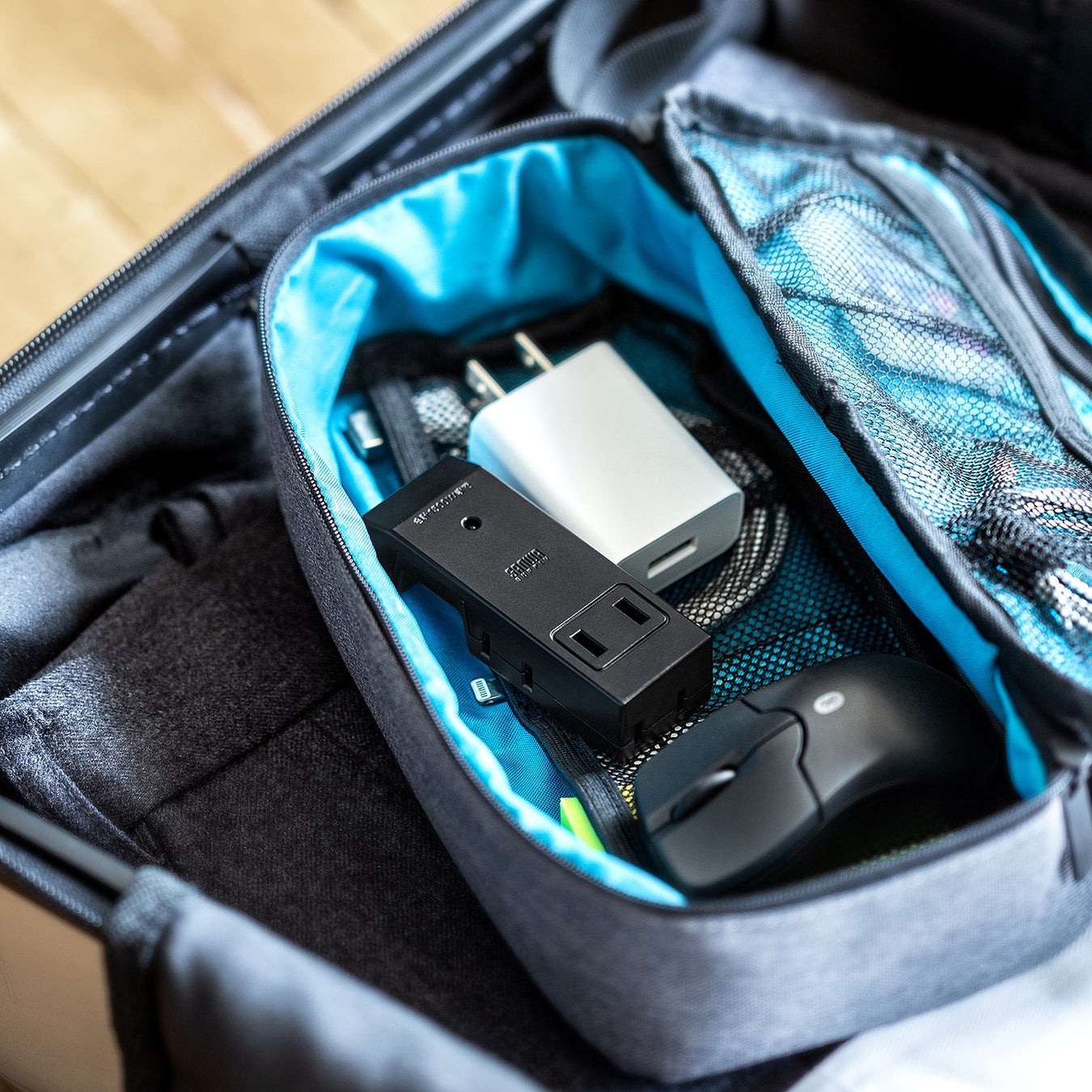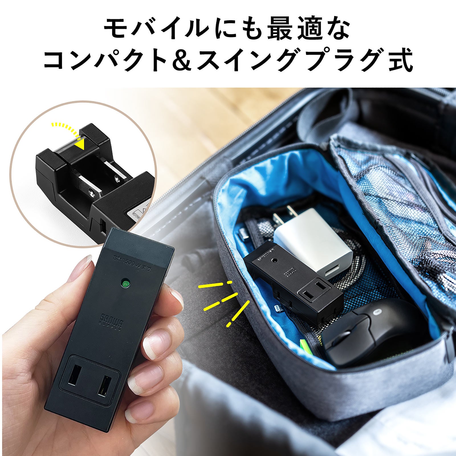 プラグ部は本体に折りたたむことができ、カバンに入れて持ち運ぶ際、カバンの中の物を傷つけず持ち運び可能です。旅行時などO持ち運びに便利なコンパクトサイズです。