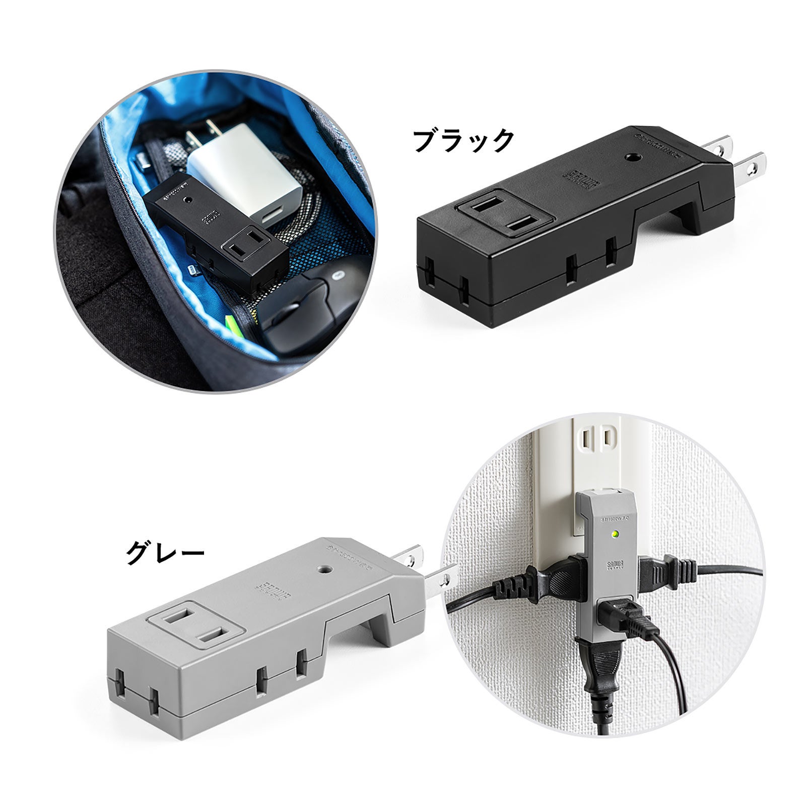 電源タップ 4個口 2P 小型 コンパクト 雷ガード スイングプラグ ブラック グレー