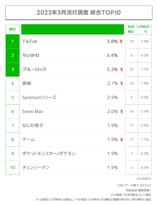 総合2位には、2022年9月以降から"若年流行調査"で10位以内に入っている「ちいかわ」、総合3位には「ブルーロック」が前回の25位から急上昇しランクインしました。4位以降はゲームタイトルの「原神」「Splatoonシリーズ」やアイドルグループの「Snow Man」や「なにわ男子」がランクインしました。