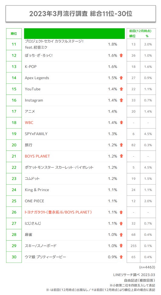 18位には、調査実施時期がWBC開催前ではありましたが「WBC」がランクインしました。21位には、グローバルボーイズオーディション番組「BOYS PLANET」が急上昇ランクインしました。また、26位には、BOYS PLANETの練習生の「トヨナガタクト」がランクインしました。