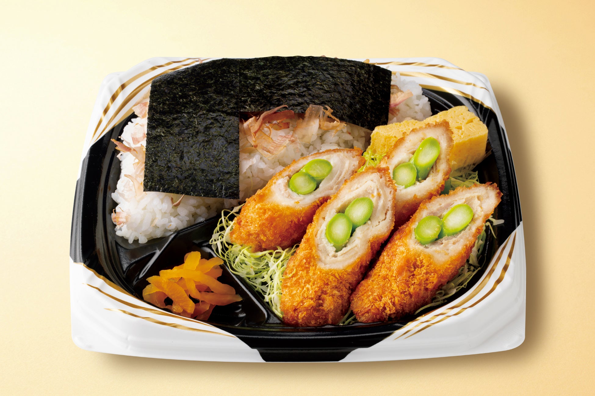 「アスパラ豚巻きフライ」は、カットしたときの鮮やかな緑色のアスパラガスの「映え」で、一見して美味しさが伝わる見た目になるようにこだわりました。細めのアスパラを2本、豚バラ肉で巻くことで、アスパラの食感をより感じることができます。また、生パン粉が油を適度に吸収することでサクサク食感が長時間キープでき、時間が経っても固くならない仕立です。これを定番人気の「のりおかかご飯」と組み合わせたことで、満足間違いなし!
