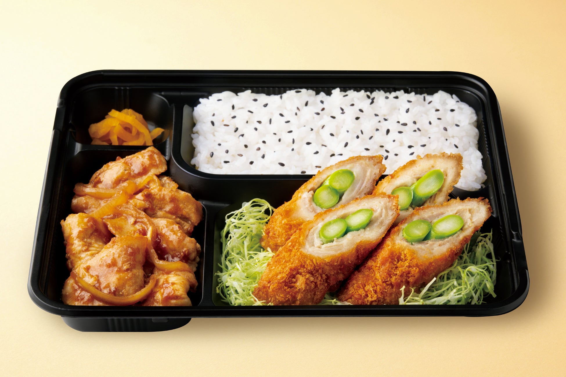 生姜焼き1食分とセットにした、ボリュームたっぷりなアスパラ豚巻きフライ生姜焼き弁当もご用意しています。