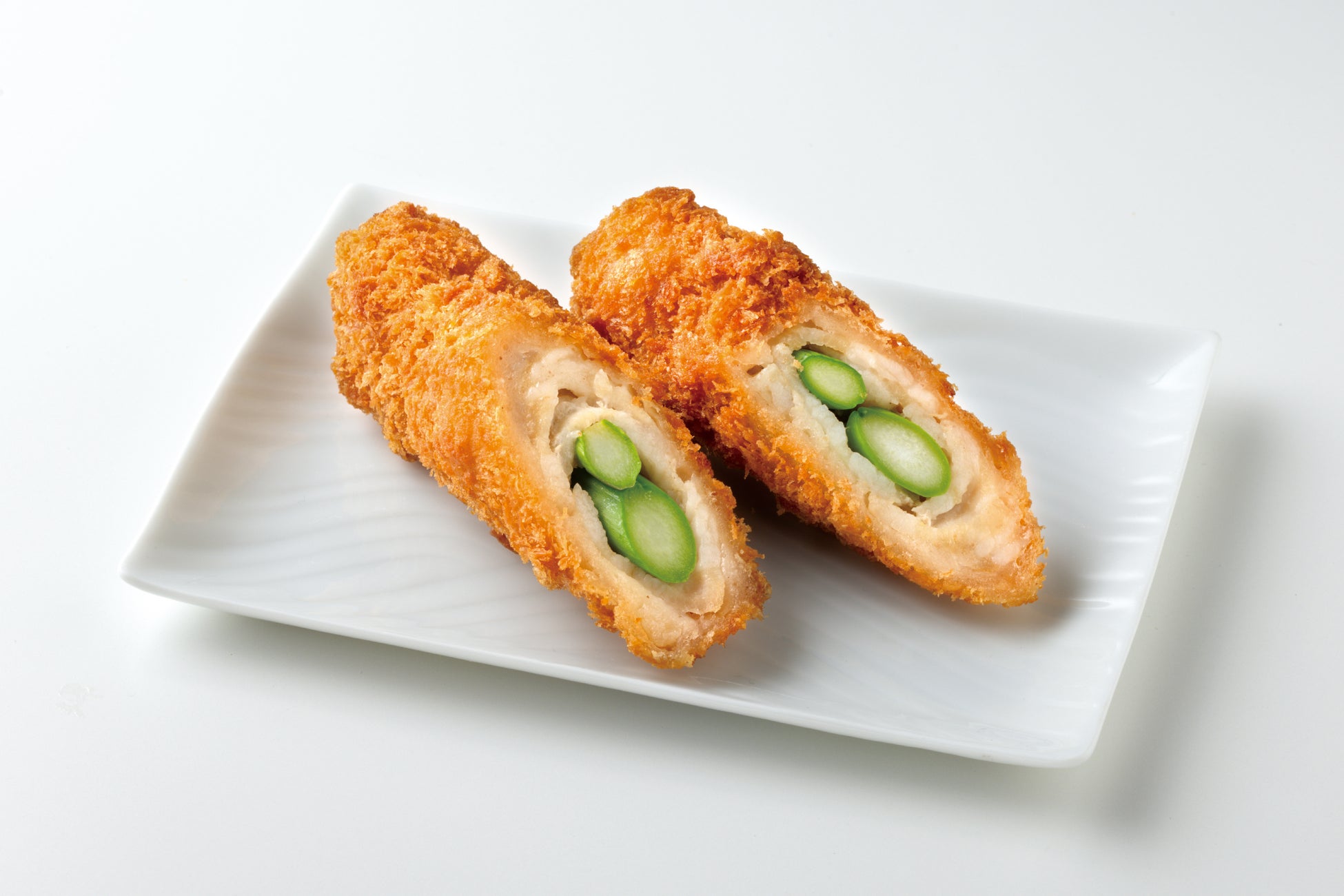 春が旬のアスパラガスを豚バラ肉で巻き上げ、サクサクふわふわの食感を楽しめる、軽いフライに仕上げました。衣に生パン粉を使用し、油っぽくないライトな揚げ物です。