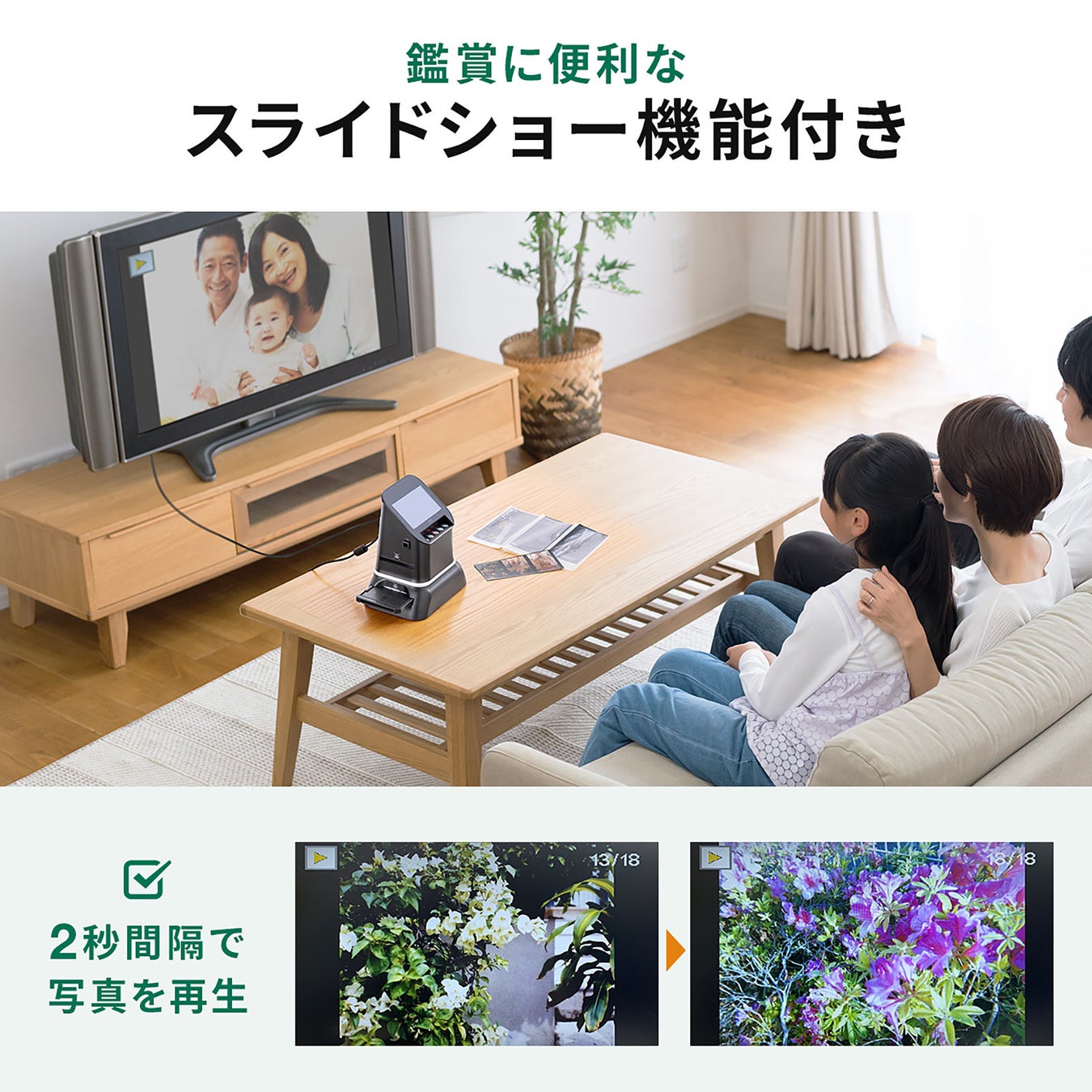 スライドショー機能を搭載しており、SDカードに保存してあるスキャンデータを液晶に映してデジタルフォトフレームのように使用することもできます。