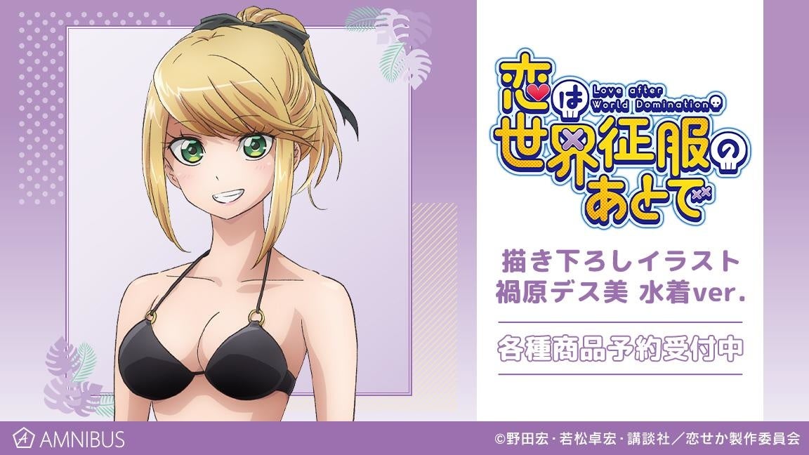 TVアニメ「恋は世界征服のあとで」の描き下ろしイラスト 禍原デス美 水着ver. 等身大タペストリーなどの受注を開始!!アニメ・漫画のオリジナルグッズを販売する「AMNIBUS」にて