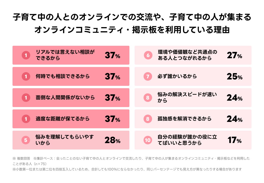 - 会ったことのない子育て中の人とのオンライン交流やコミュニティ・掲示板の利用経験があるママは24%!そのうち90%近くが”子育ての不安や悩みの解決”につながっていると回答