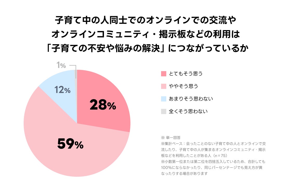 また、あると答えた方(n=75)にそれが『子育ての不安や悩みの解決につながっていると感じるか』を聞いたところ、90%*近くがそう思うと回答しました。オンラインで交流しているママはまだ2割ほどですが、経験者の調査結果から子育ての不安や悩みの解消につながる方法であることが分かります。