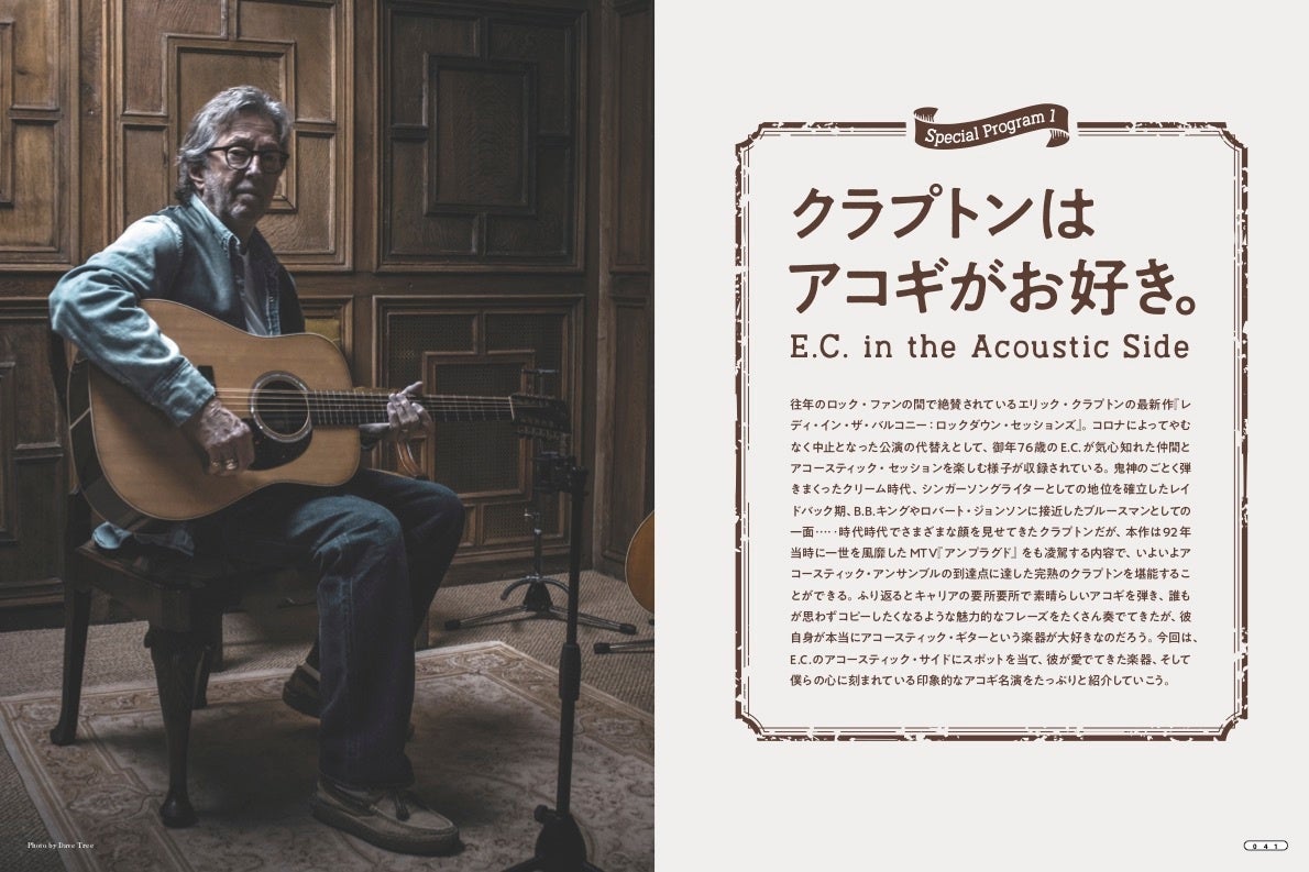 コロナ禍中に生まれたアコースティック名盤として、往年のロック・ファンの間で絶賛されているエリック・クラプトンの最新作『レディ・イン・ザ・バルコニー:ロックダウン・セッションズ』。時代時代でさまざまな顔を見せてきたクラプトンですが、本作は1992年に一世を風靡したMTV『アンプラグド〜アコースティック・クラプトン』に勝るとも劣らない内容で、アコースティック・アンサンブルの頂点に達した円熟のクラプトンを堪能することができます。本誌では、E.C.のアコースティック・サイドにスポットを当て、最新作で使用している謎の12弦ギターの詳細や彼が愛でてきた思い出深いアコースティック・ギターの解説、そして皆の胸に刻まれているであろう印象的なアコギ名演をたっぷりと紹介していきます。
