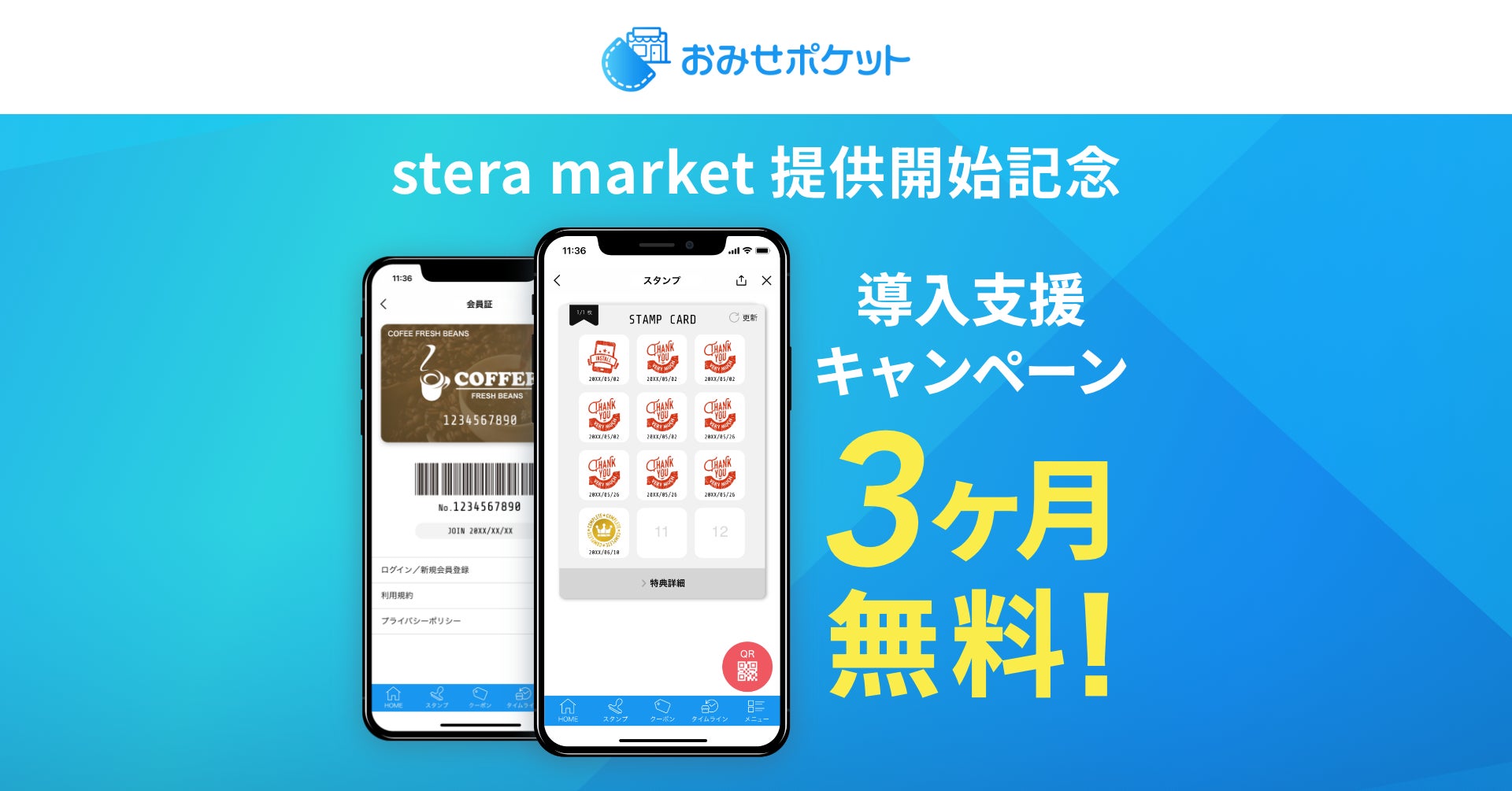 「stera market」での「おみせポケット」提供開始を記念して、期間中に新規にお申込みをいただいた企業・店舗様に限り、月額費用を3ヶ月無料にてご提供いたします。