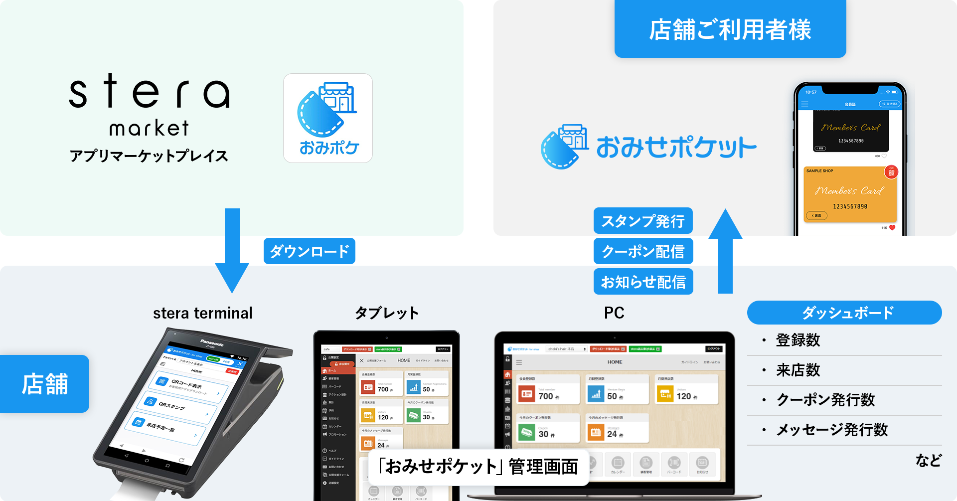 「おみせポケット」は、中小事業者の店舗における集客・販促活動を支援するスマートフォンアプリです。「おみせポケット」の管理画面は「stera terminal」、PC、タブレットに対応しており、デジタル会員証やスタンプカードの発行、プッシュ通知、クーポン、ニュースなどの配信・管理が行えます。