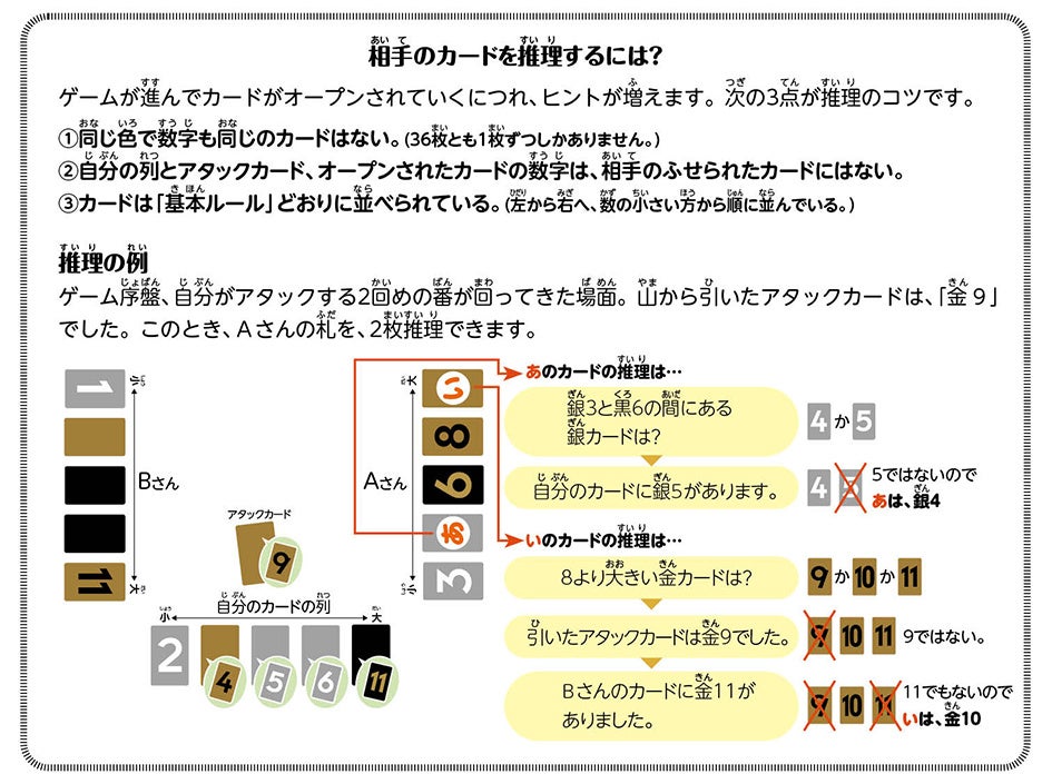 従来は白黒2色であったカードを金銀黒の3色に、またジョーカーもプラスされ、新たなルールが開発されました。相手のカードの数字を推理するのは従来通りですが、論理的な推理の要素が強くなり、さらに奥深く高度なゲームになっています。
