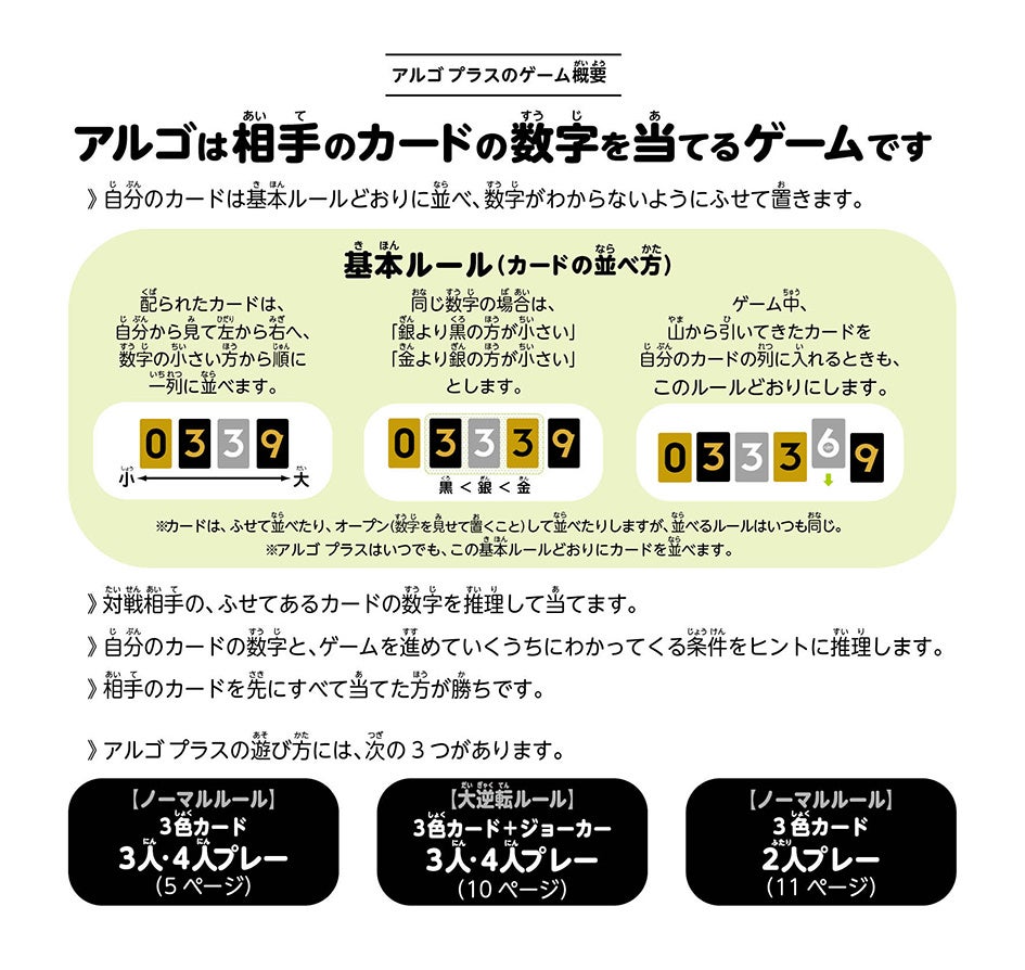 従来のアルゴを知らない方でもよくわかるように構成された「アルゴ プラス ルールブック」は、オール4色16ページ。また、従来のアルゴ(アルゴ ベーシック)と同様の遊び方も、銀黒カードを用いてプレーできるようになっており、別冊「アルゴ ベーシック ルールブック」も付属しています。