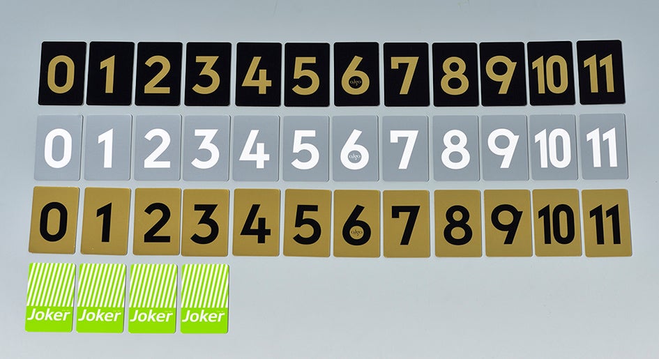 金銀黒0〜11の計36枚のカードを用いるため、3〜4人プレーがメインルールになっています。カードの色が増えたことで、より論理的思考力が求められます。新たな論理の勝負を存分にお楽しみいただけます。