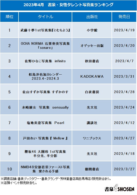 <2023年4月 書泉・女性タレント写真集売上ランキング>