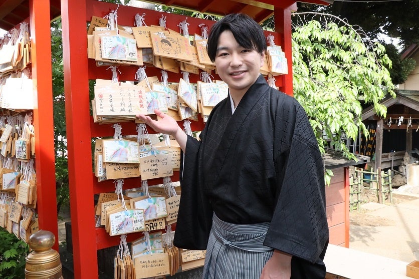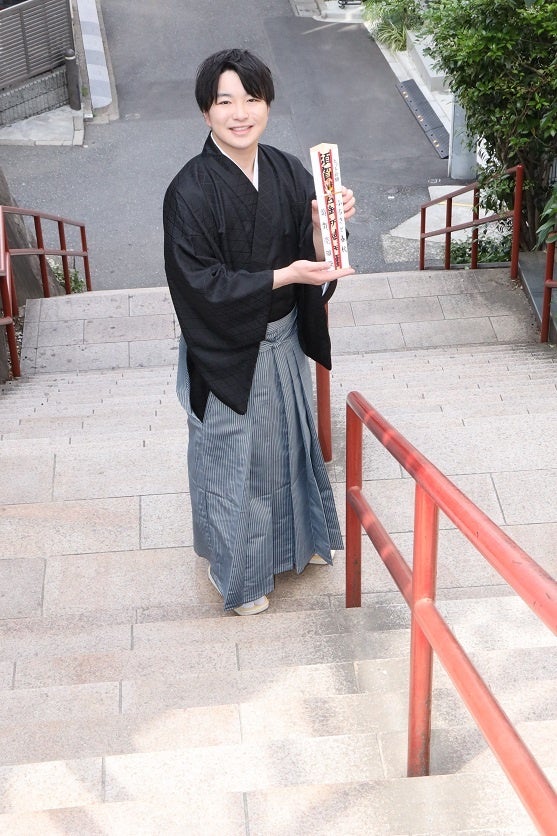 デビューを6日後に控えたこの日、芸名にちなんで東京・四谷の須賀神社をヒット祈願の場所に選び、社殿でデビュー曲を作詩した北爪葵氏、作曲した南乃星太氏と共にご祈祷を受けた。