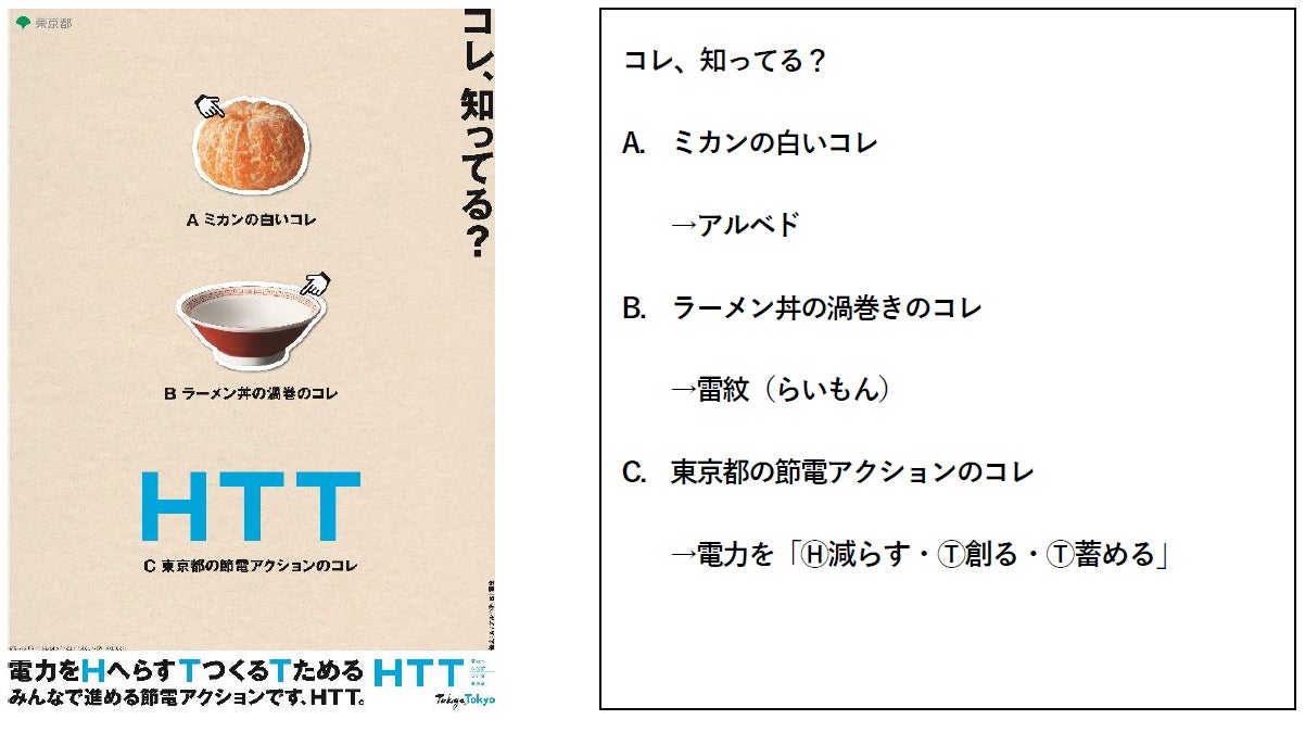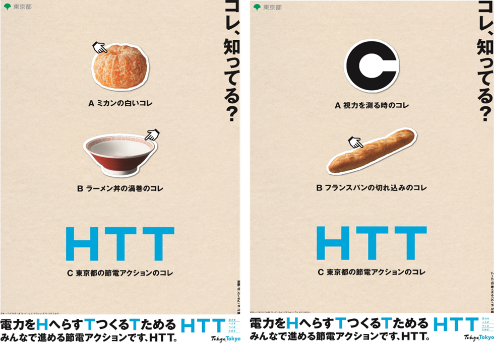 新たに掲出される広告では、“存在はよく知っているのに名前があまり知られていないモノ”の代表を並べて、東京都における節電アクションである「HTT」の認知と理解を促します。
