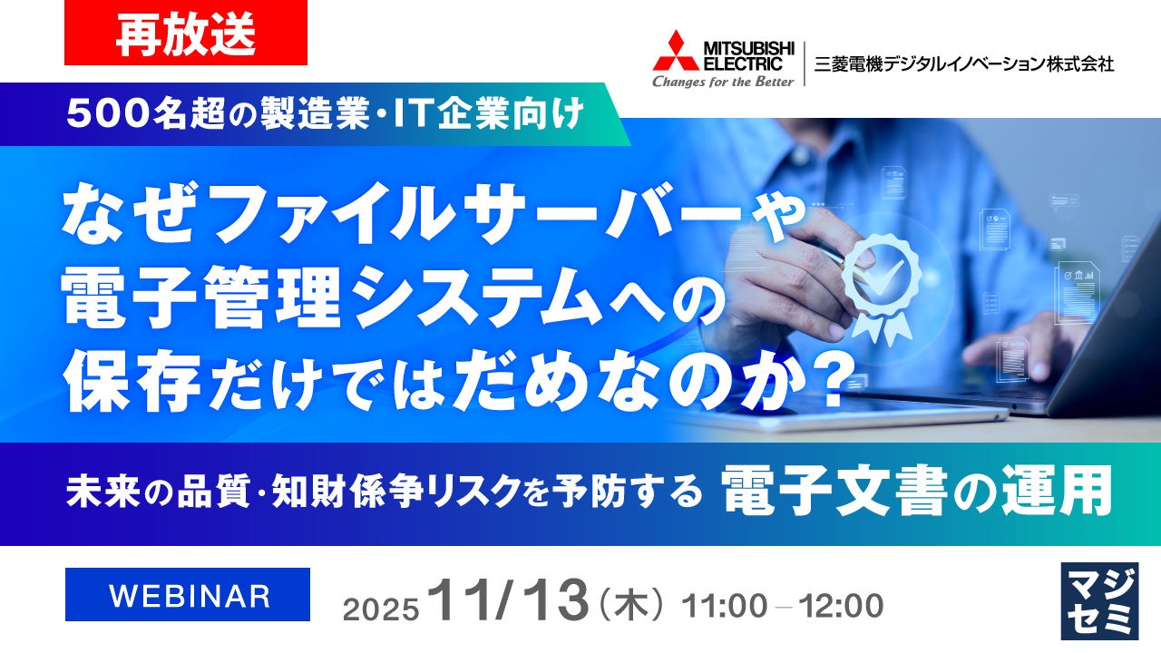 マジセミ株式会社は「【再放送】なぜファイルサーバーや電子管理システムへの保存だけではだめなのか?」というテーマのウェビナーを開催します。