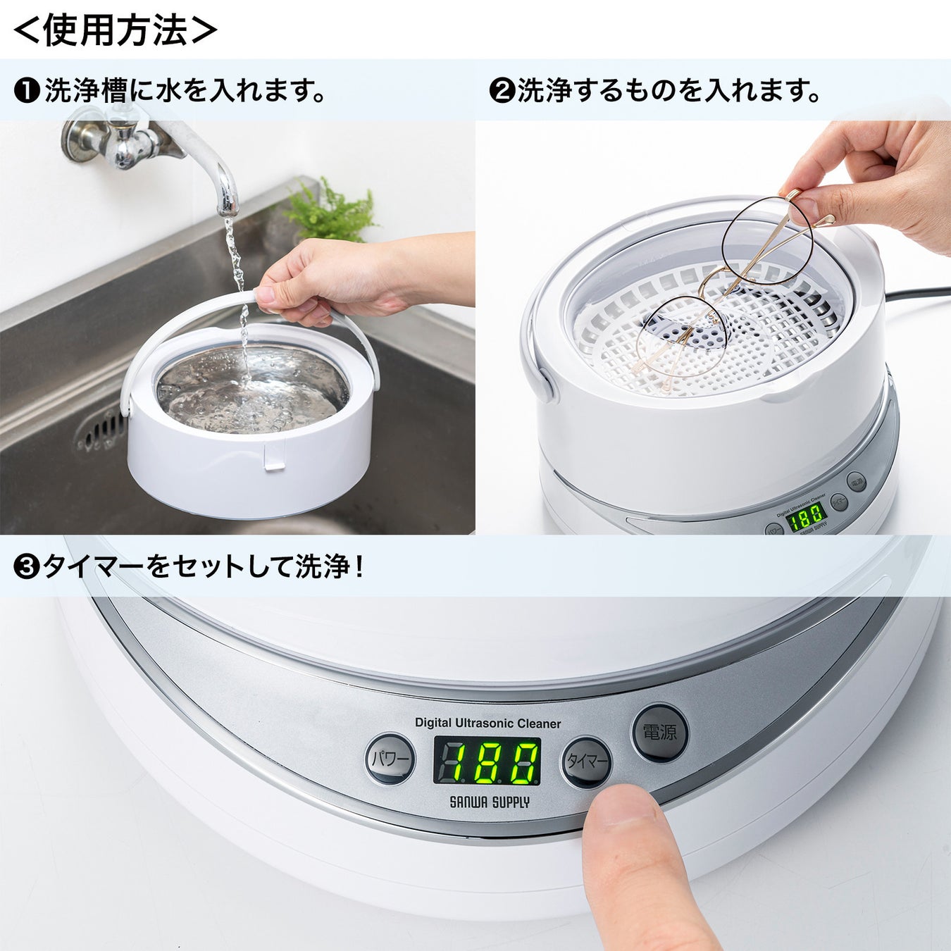 普段のお手入れでは手の届かない場所の汚れを、超音波でスッキリ落とします。洗浄槽に水と洗浄するものを入れてボタンを押すだけなので、操作も簡単です。