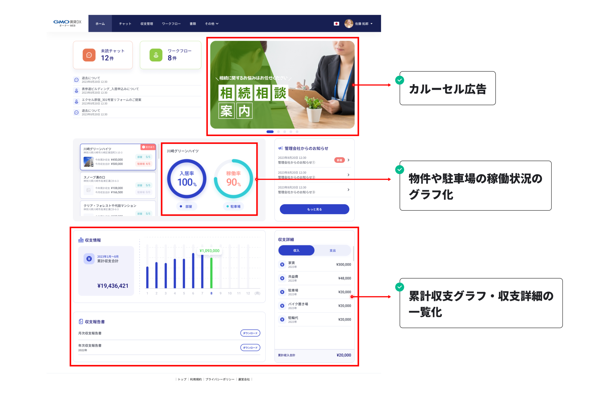 高齢化が進む日本において、幅広い年齢層のオーナーにとってより使いやすいツールとするため、「GMO賃貸DX オーナーアプリ」のオーナー向けWEBページのデザインを一新し、物件の稼働状況/収支情報のグラフ表示やカルーセル広告(※1)の設置により視認性を向上させました。