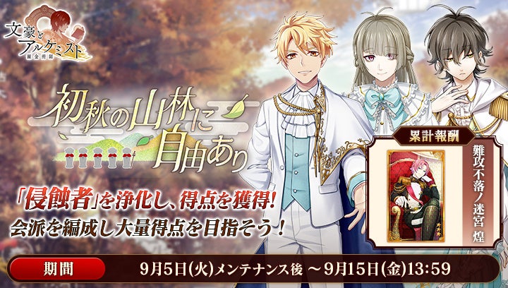 イベント『特殊調査任務「初秋の山林に自由あり」』を開始いたしました。本イベントは、イベント限定のステージに潜書して、得点を集める事が目的です。集めた得点の総獲得数が一定の値に達すると、装像「難攻不落ノ迷宮 煌」や、アイテムを獲得することができます。
