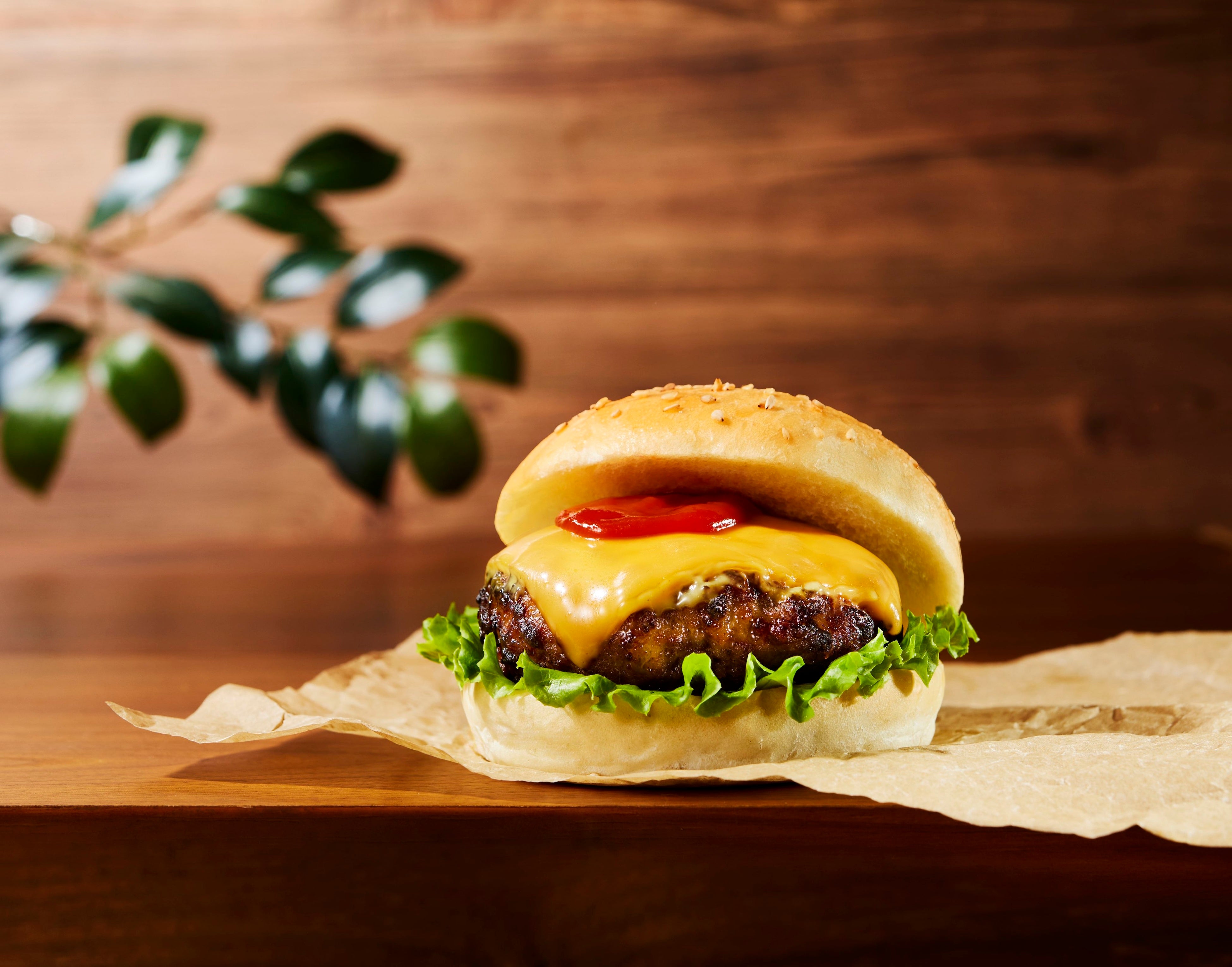 「肉を味わうチーズバーガー」は、バンズを「全粒粉」から「米粉」入りに変更してソフトな食感にすることで、100g超の厚みのあるハンバーグの食べ応えをさらにアップさせました。