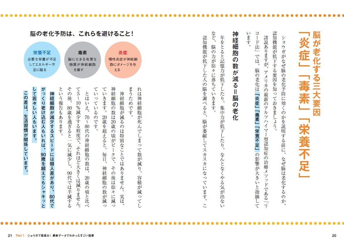 年齢とともに脳の老化は始まり、ゆっくりと衰えていきます。脳の老化と生活習慣には深い関係があり、脳の老化予防には食事が大事! ショウガの健康効果とその栄養を効率的にとるための食べ方のコツや、若返り効果のある食材×ショウガを使ったレシピ82点を掲載。