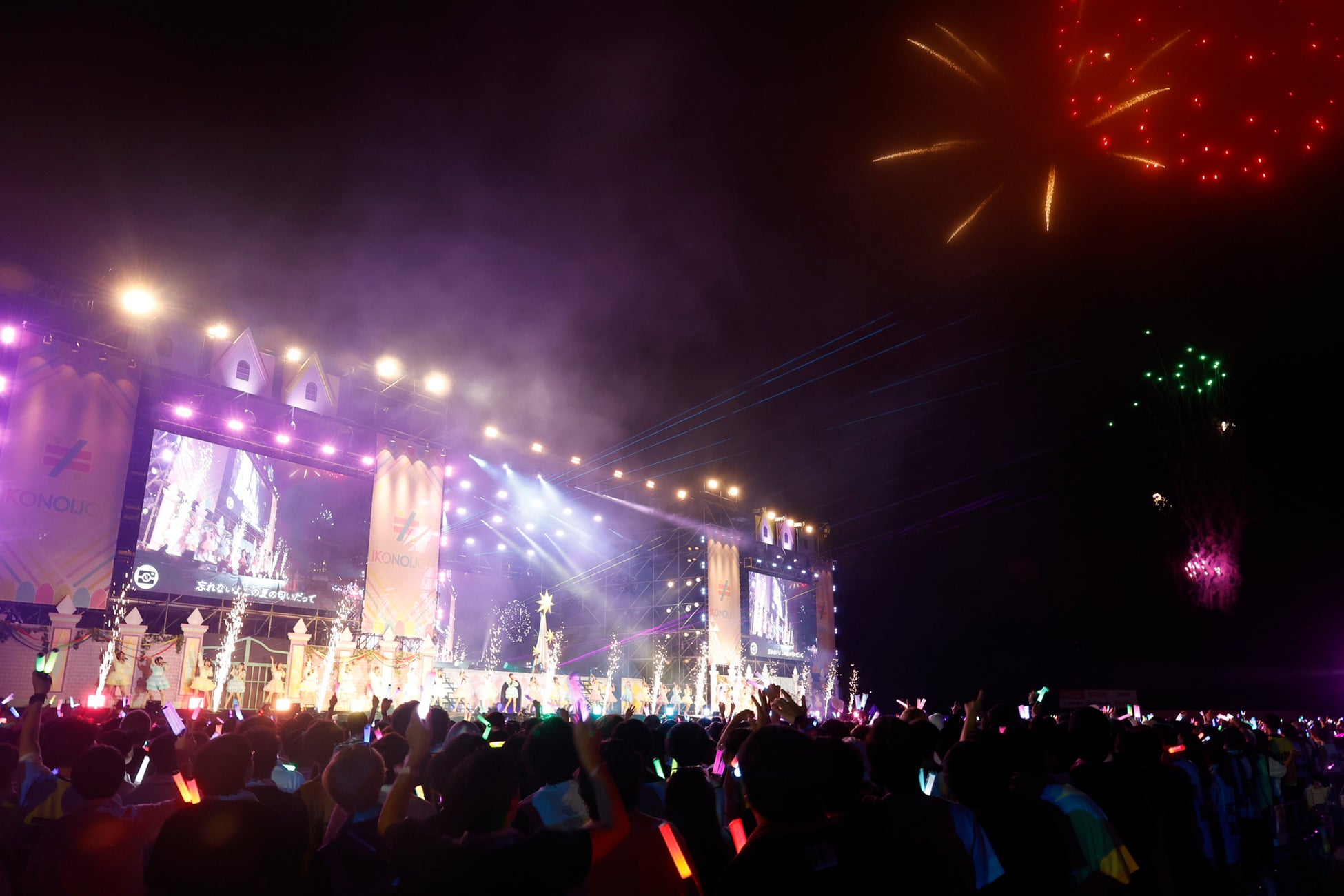 ライブ終盤には3組が集結し、イコノイジョイとしてラストスパートを駆け抜ける。途中のMCでは≒JOY 2周年コンサート「≒JOY 2nd ANNIVERSARY PREMIUM CONCERT」のライブBlu-ray・DVDが12月11日にリリースされること、≠ME 6周年コンサート「≠ME 6th ANNIVERSARY PREMIUM CONCERT」が2025年2月1日に埼玉県・さいたまスーパーアリーナで行われること、=LOVE 7周年コンサート「=LOVE 7th ANNIVERSARY PREMIUM CONCERT」の模様がライブ映画として2025年春に全国公開されることが特報映像を通して明らかに。観客の拍手を浴び、笑顔いっぱいに喜びを語った3組の合同楽曲『トリプルデート』を晴れやかに歌唱。パフォーマンスに合わせて夜空に盛大な花火が打ち上がり、メンバーとファンの心に鮮やかな思い出を刻んだ。アンコール以降も会場を包む特別な幸福感が膨れ上がっていく「イコノイジョイ 2024」。最後は夏の残り香を感じさせるこの季節にぴったりな「夏祭り恋慕う」でライブがフィナーレへと導かれた。