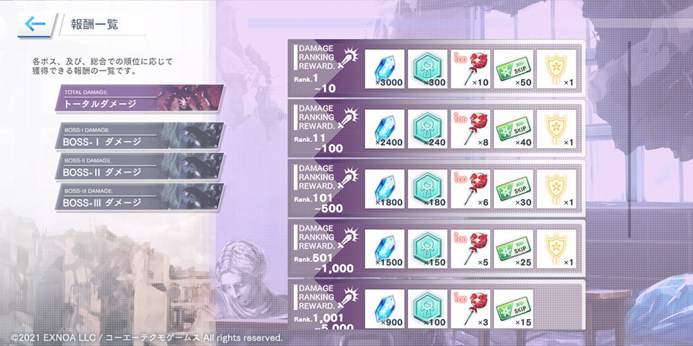 「火力演習BETA」トップ画面のランキングボタンをタップすると、ボスに与えたダメージ量やトータルダメージで決定するランキングを確認することができます。各ランクに応じた報酬が配布されますので、ぜひ上位を目指してみてください!報酬内容は報酬確認ボタンから閲覧可能です。