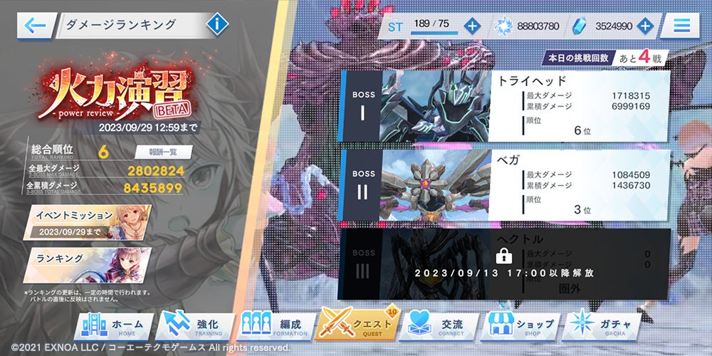 「火力演習BETA」とは、期間限定で出現する複数のボスに対して、一度の戦闘で与えた最大ダメージを他プレイヤーと競う、ダメージランキング形式の新たなコンテンツとなります。