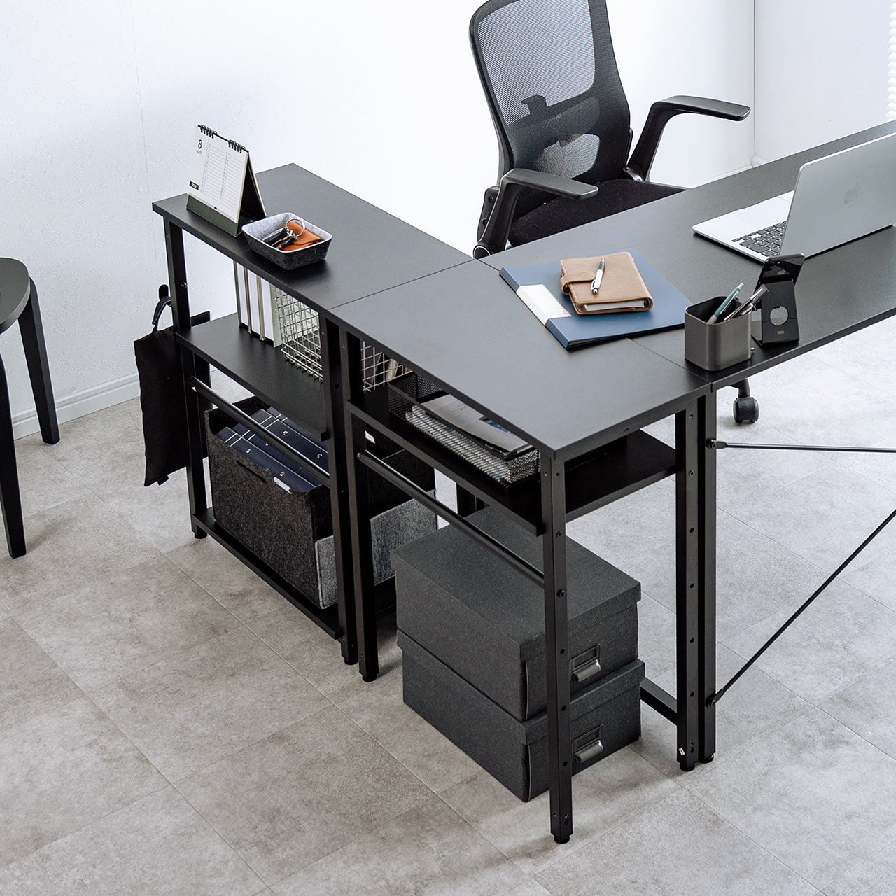 分割して2つのシェルフとして使うことも可能です。デスク横に設置して、作業スペースの拡張にもお使いいただけます。