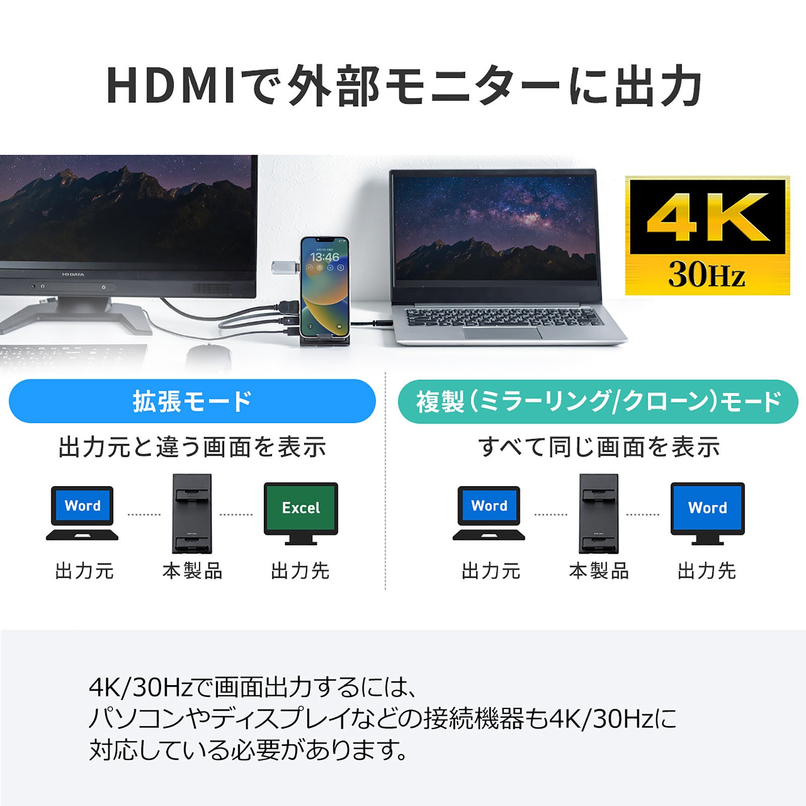 HDMI出力は4K/30Hz対応で、対応機器であればソフトウェアのインストールなしで簡単にマルチディスプレイ環境(ミラーモード/拡張モード)を実現できます。