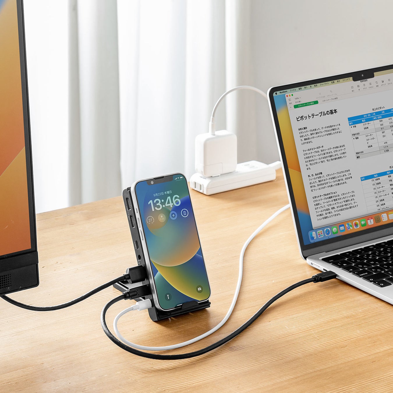本製品は、コンパクトで前面にスタンドを内蔵し、最大でスマートフォンが2台設置できるスタンド付きドッキングステーションです。