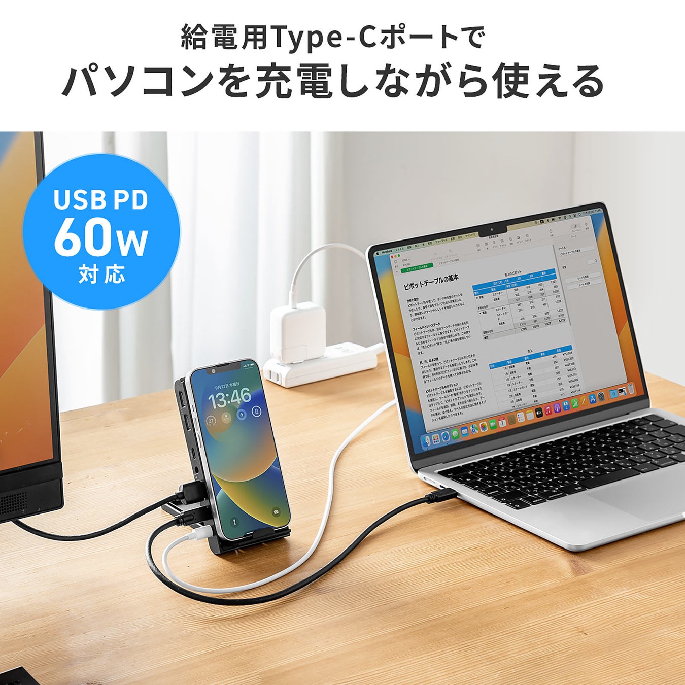 Type-CポートはPD対応のACアダプタを接続すれば周辺機器を使用しながらUSB PD(USB Power Delivery)対応のパソコンの充電ができます。最大60Wまでの充電に対応しています。