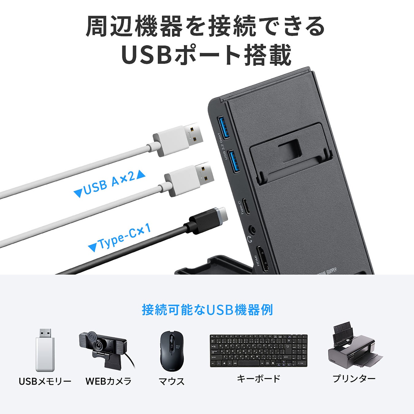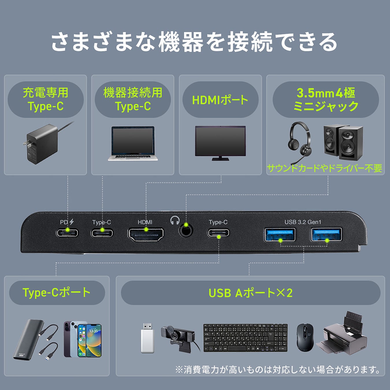 HDMI出力ポート、USB×A×2、、Type-C×1、3.5mmコネクタ×1、給電用Type-C×1、機器接続用Type-C×1を搭載しています。