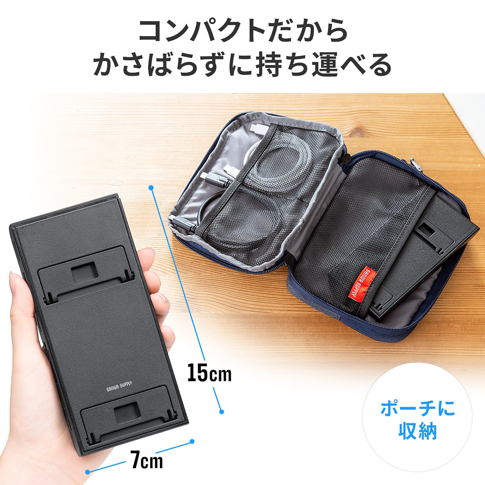 前面のスタンドは、厚さ1.2cmまで対応し3段階の角度調整が可能です。