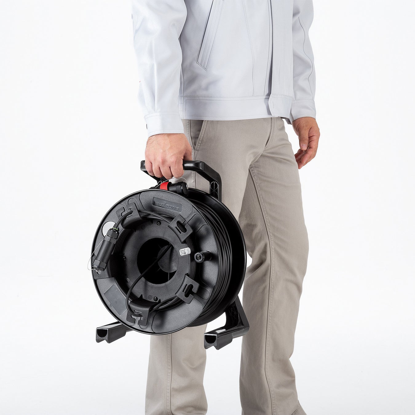 回転式のドラムが付属しており、敷設や収納するのに便利です。イベントやセミナー、講義などの長距離で映像を表示させたい環境での活用に最適です。持ち運びに便利な取っ手付きです。
