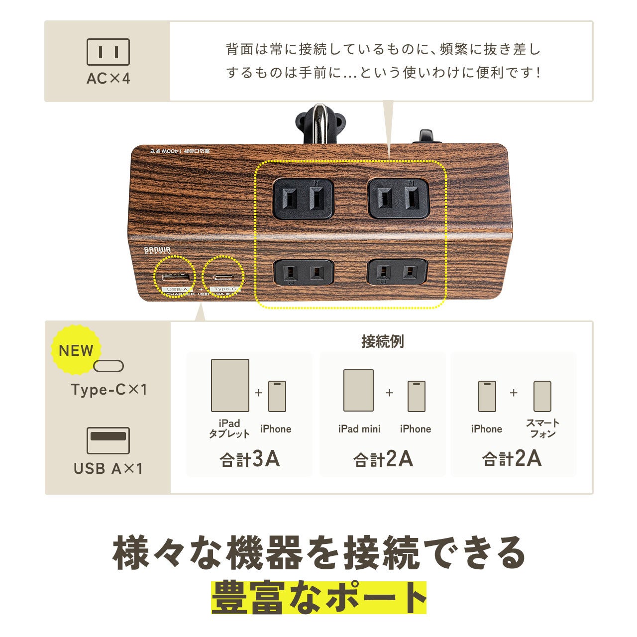 電源タップ USB充電 Type-C搭載 一括集中スイッチ 4個口 3m クランプ固定 木目