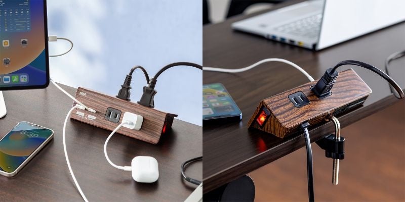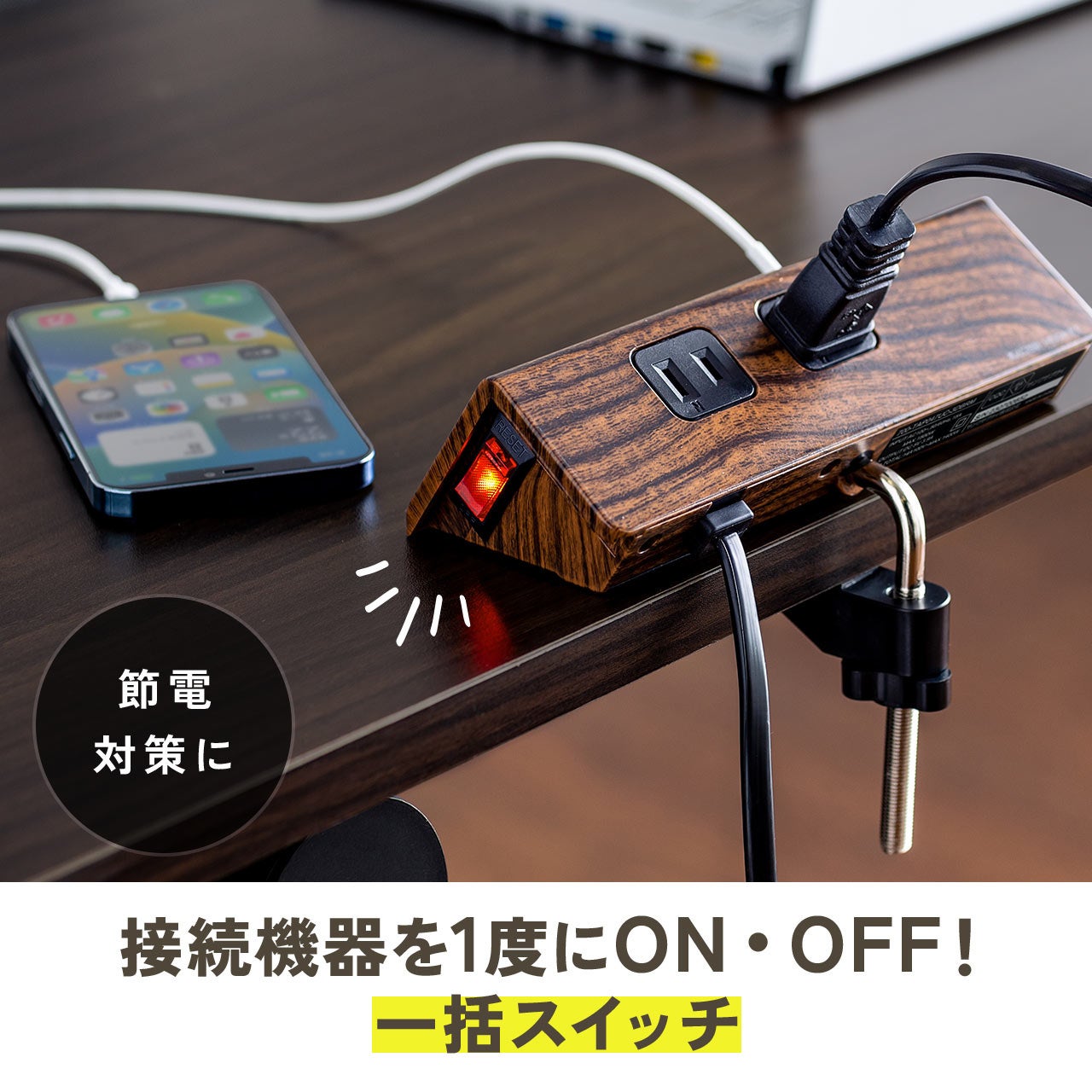 本製品は、デスクなどにクランプで設置できるUSBポート付き電源タップです。