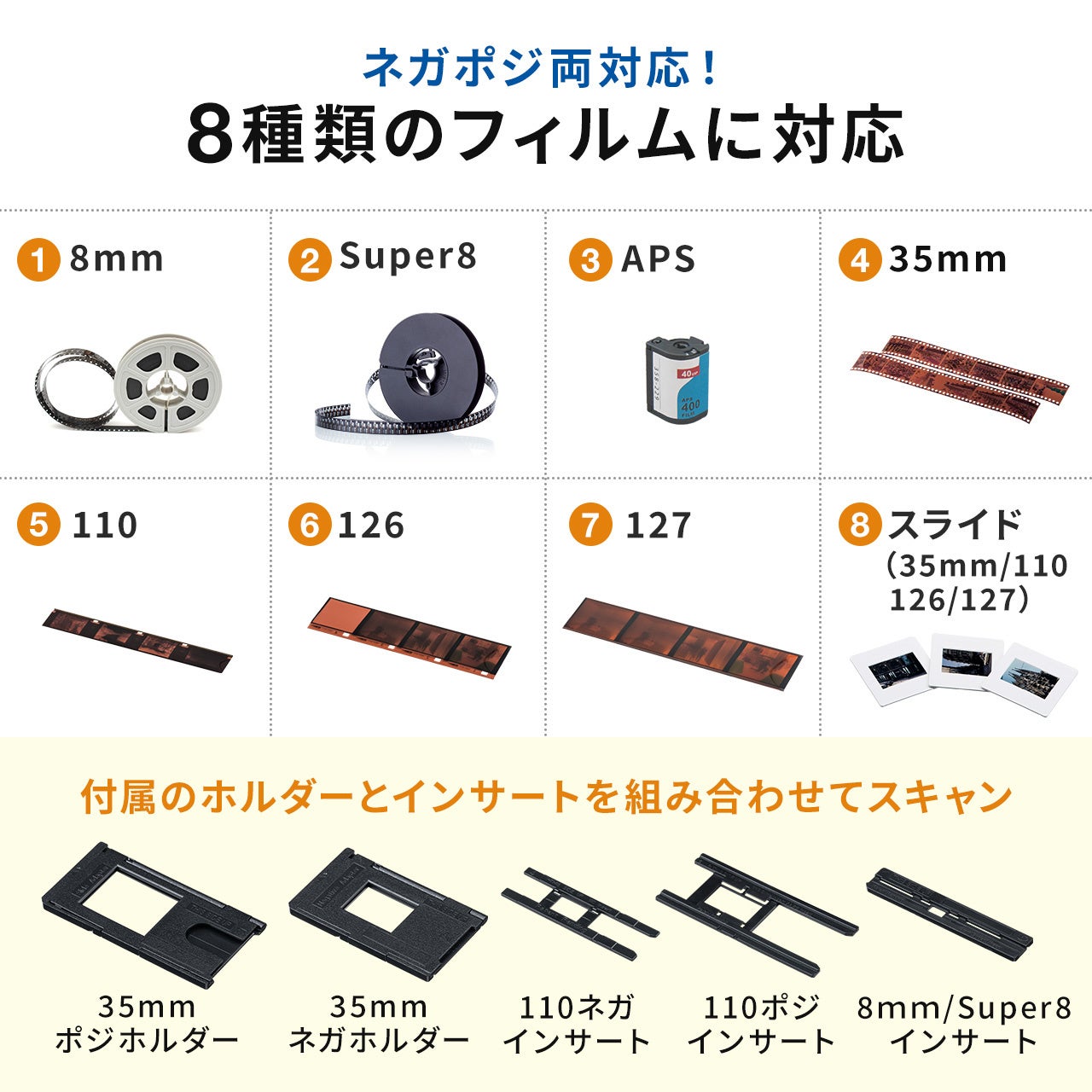 1400万画素のCMOSイメージセンサーを採用しています。現像したフィルムをスキャンしデータ化すれば、劣化することなく保存ができます。35mm/110/127/8mm/Super8/APS/スライドフィルムと様々なフィルムに対応しています。