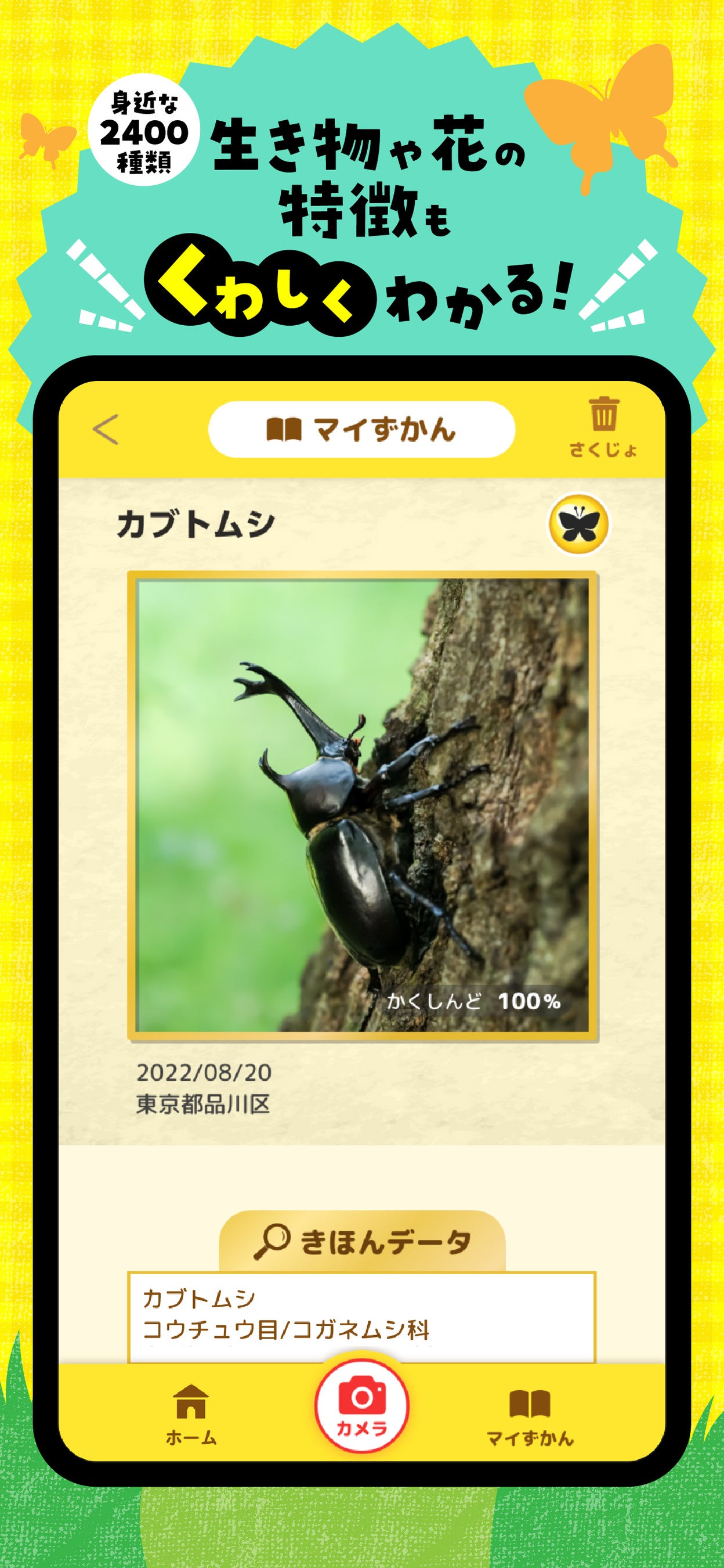 アプリのカメラ画面で写真を撮るだけで、AIが生物の名前を瞬時に識別!