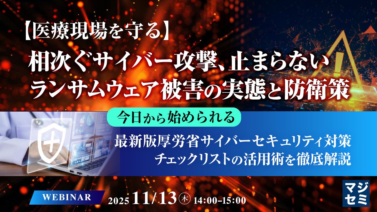 マジセミ株式会社は「【医療現場を守る】相次ぐサイバー攻撃、止まらないランサムウェア被害の実態と防衛策」というテーマのウェビナーを開催します。