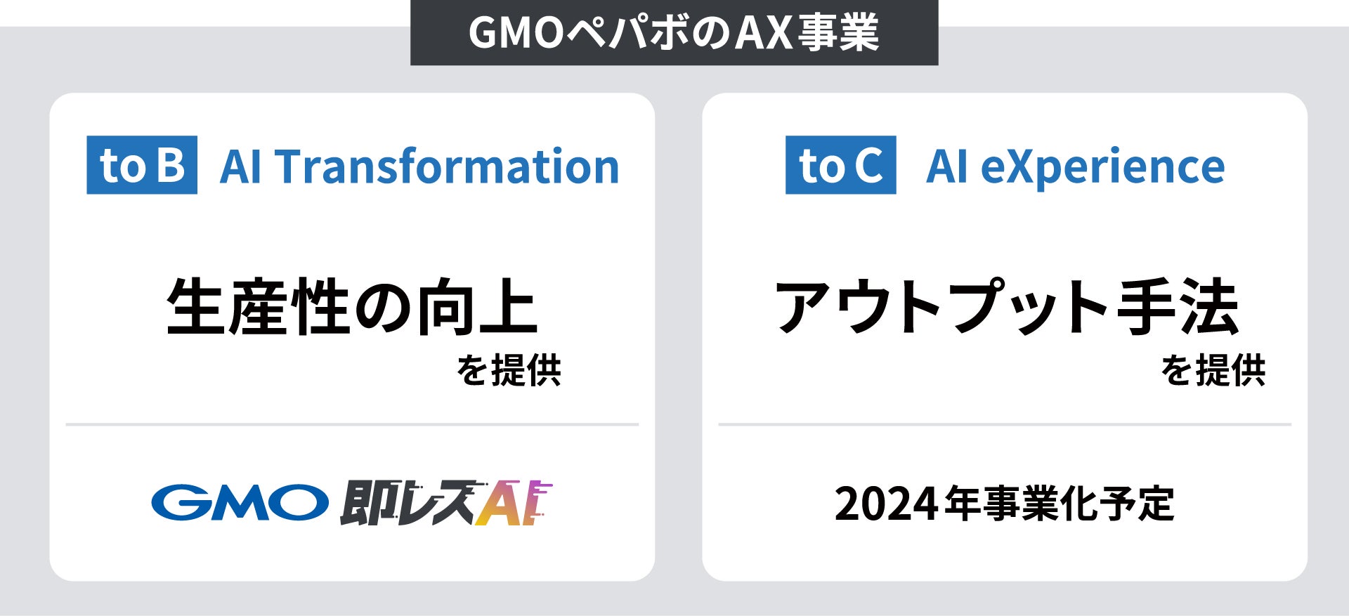 このたびGMOペパボでは、本取り組みを加速させるべく、AXチームを新設し、主に中小企業を対象とした生産性向上に寄与する“AI Transformation”領域と、AIを利活用した新たなアウトプットの手法の提供によるクリエイターのアウトプット支援を行う“AI eXperience”領域の二軸にて、AX事業を展開してまいります。