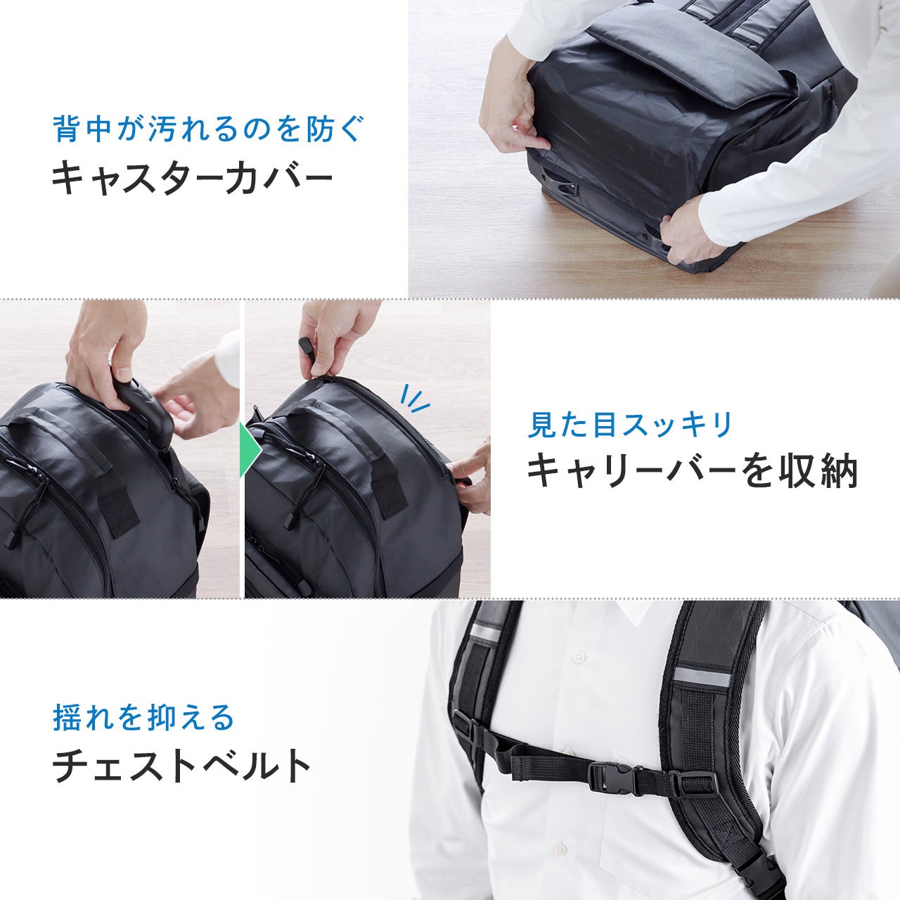 リュック時は、キャスターカバー付きで、ショルダーベルトはクッション入りでベルト長も調整が可能です。