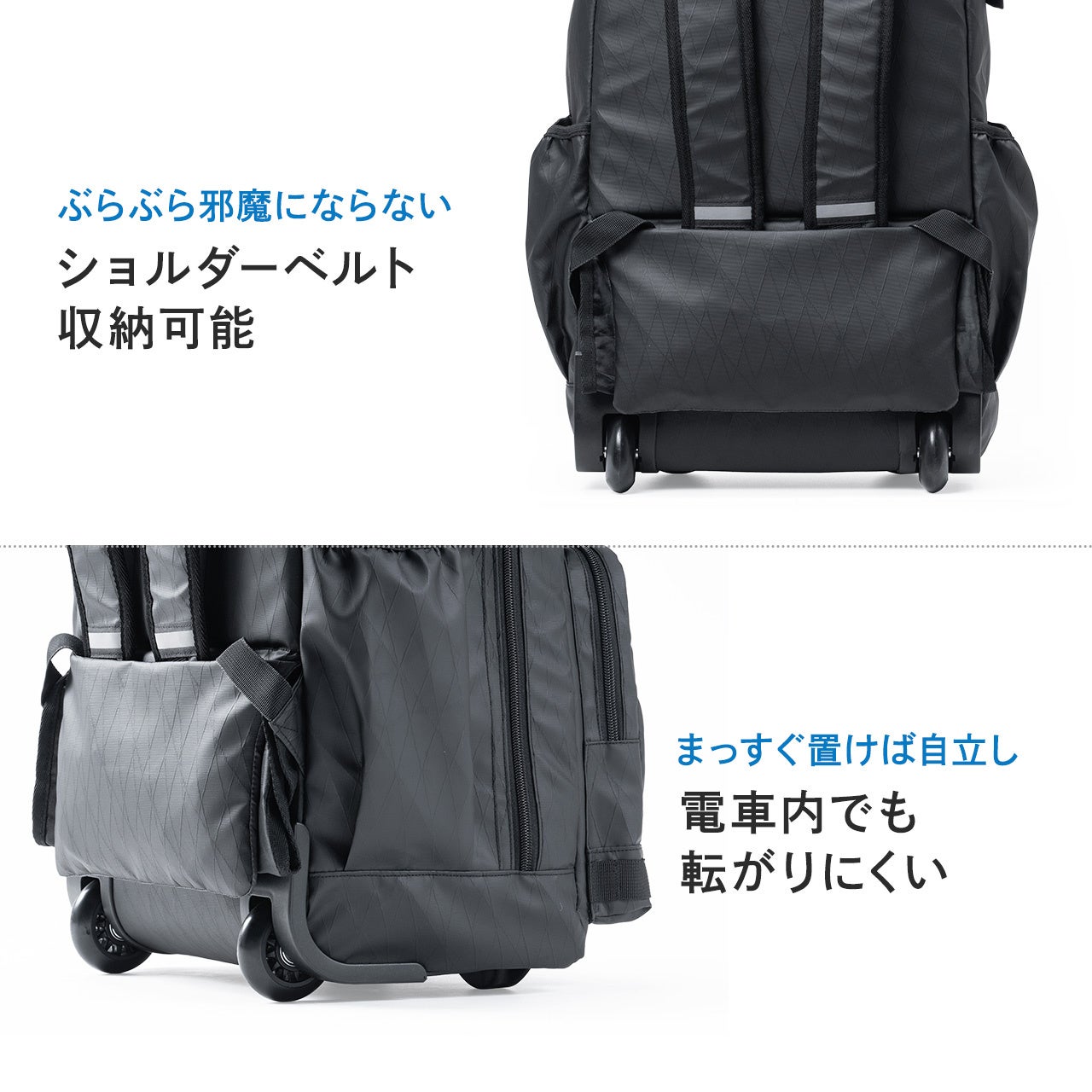 キャリーバッグ使用時は、2輪キャスター仕様、3段階でキャリーバー調整可能、ショルダーベルトも収納可能です。