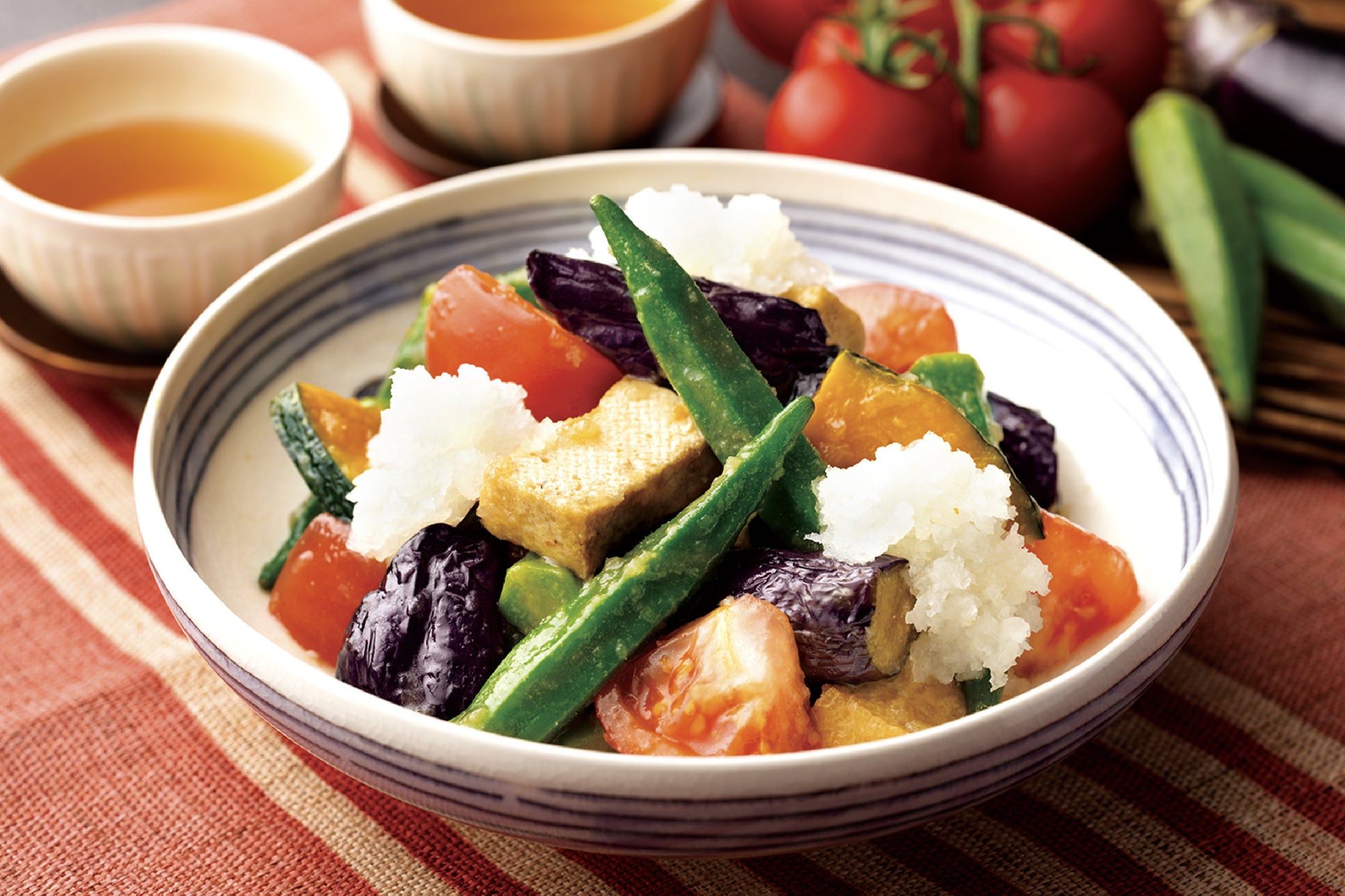 ・「熊本県産なすと夏野菜の生姜みぞれ」は、夏野菜(トマト、南瓜、おくら)とともに、なすの美味しさを引き立てる宮崎県産大根おろしで仕立てた生姜みぞれソースで和えました。
