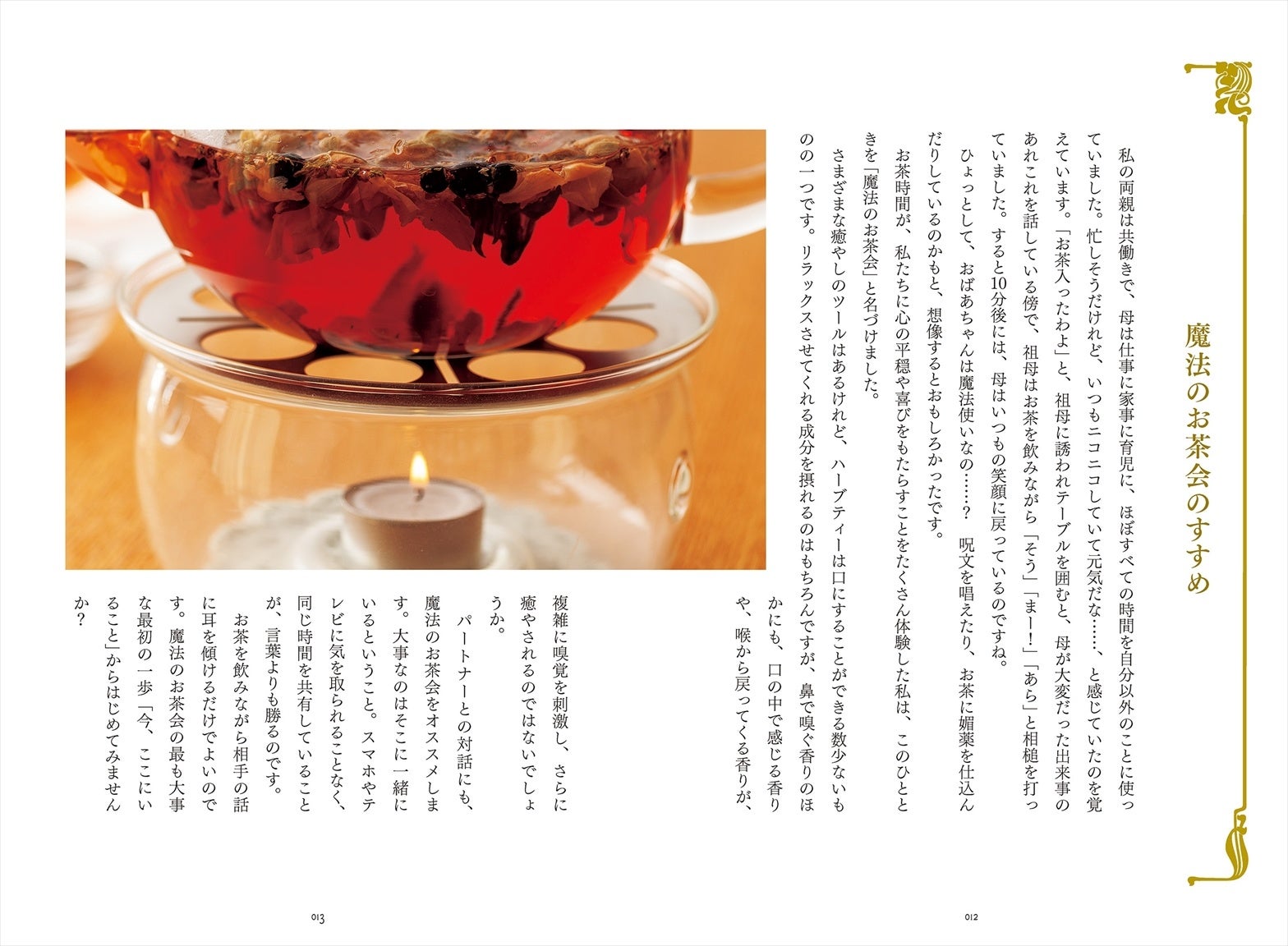 コミュニケーションのツールとしても、ハーブはいい仕事をしてくれます。著者のしばたみかさんは、これまでオンラインで「魔法のお茶会」を多数開催。そこではコミュニケーションのトラブルや自らのアイデンティティーに関わる課題など、さまざまなお悩みが語られました。本書では、今の時代だからこそ増えてきたお悩みを、少しでも軽くするためにブレンドされたレシピを多数取り上げました。「魔法のお茶会に」参加した方からは「心の悩みが解消できた」、「明日の元気が湧いてきた」と好評をいただいています。もちろん、ハーブの温かさを感じながら自分の心の声に耳を傾けたり、家族とのいい時間を過ごすためにも、本書で紹介しているオリジナルのブレンドレシピはきっとお役に立つでしょう。