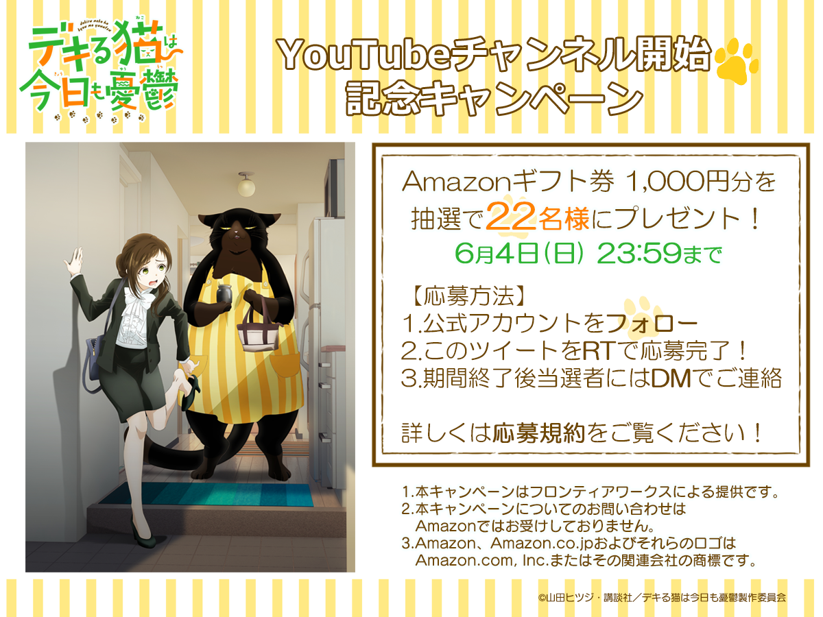 公式Twitter(@dekineko_anime https://twitter.com/dekineko_anime)では、5月29日(月)より、公式Twitterをフォロー&対象ツイートをRTいただいた方の中から抽選で22名様にAmazonギフト券1000円分が当たる「公式YouTube開設記念Twitterキャンペーン第4弾」を開催!たくさんのご参加、お待ちしています!